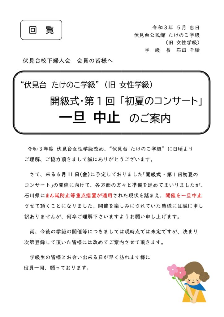 女性学級名称変更と開級式一旦中止のご連絡 今年度より、「伏見台女性学級」の名称を「伏見台たけのこ学級」に変更することとしました。これまでの女性学級の活動に加えて金沢SDGsの視点を取り入れ、多様性を重視し、女性に限らず広く伏見台校下在住の方が参加できるようになりました。