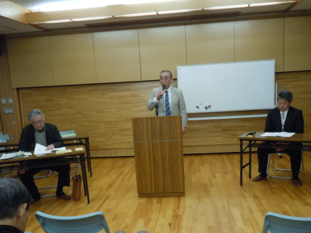 足元が悪い中ご出席いただき有難うございます。春の交通安全週間が始まっていますがマナーを守って、安全運転・交通安全に努めましょう。今、私たちの生活環境にも様々な変化が起こっています。老人会としても後で審議していただきますが「老人会の活性化に向けた提言」に掲げた様に変わらなければならないと思います。また、環境の変化があっても皆様により沿って「明るく・元気に」を目標に活動したい。