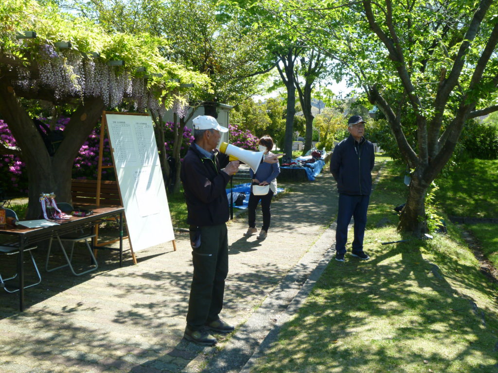 雲一つない絶好の天気です。後ろの藤棚や公園のつつじ・皆様の元気も今盛りとなっております。本日は、シニアクラブと民生・児童協議会の共催となっております皆様も張り切って頑張りましょう。